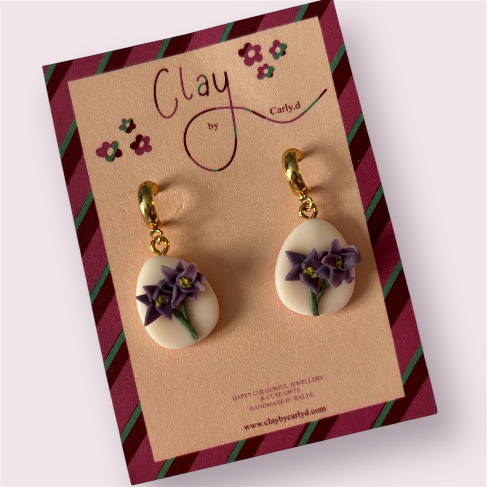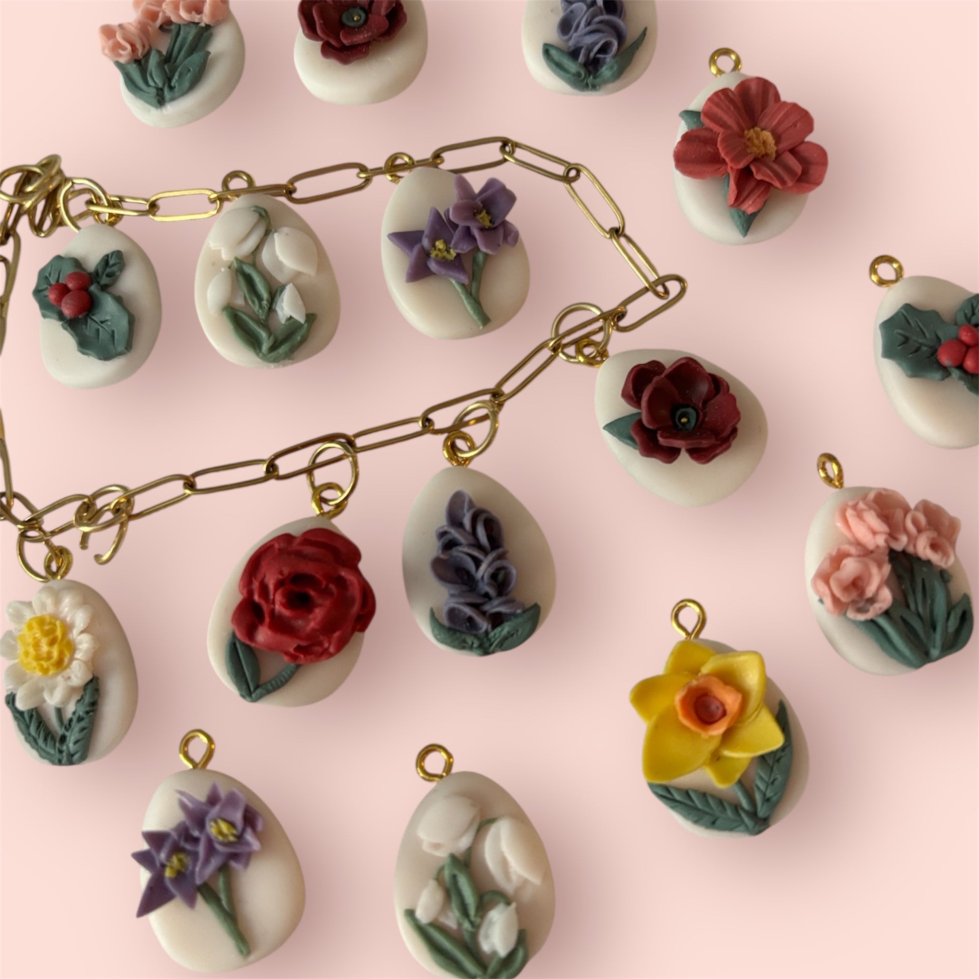 Handmade polymer clay birth flower charms, each inspired by a different month and full of tiny floral details.