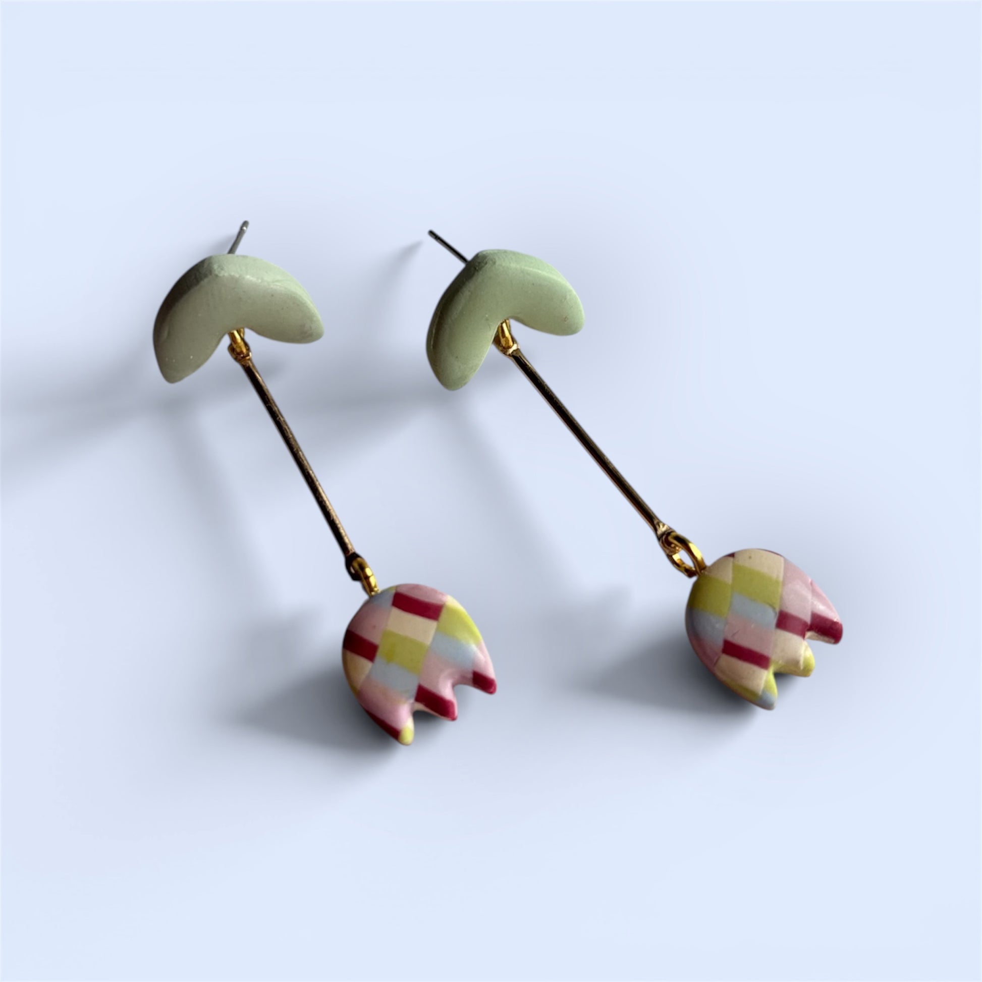 Circus inspired checkerboard tulips on gold plated droppers with leaves on stainless steel hypoallergenic studs