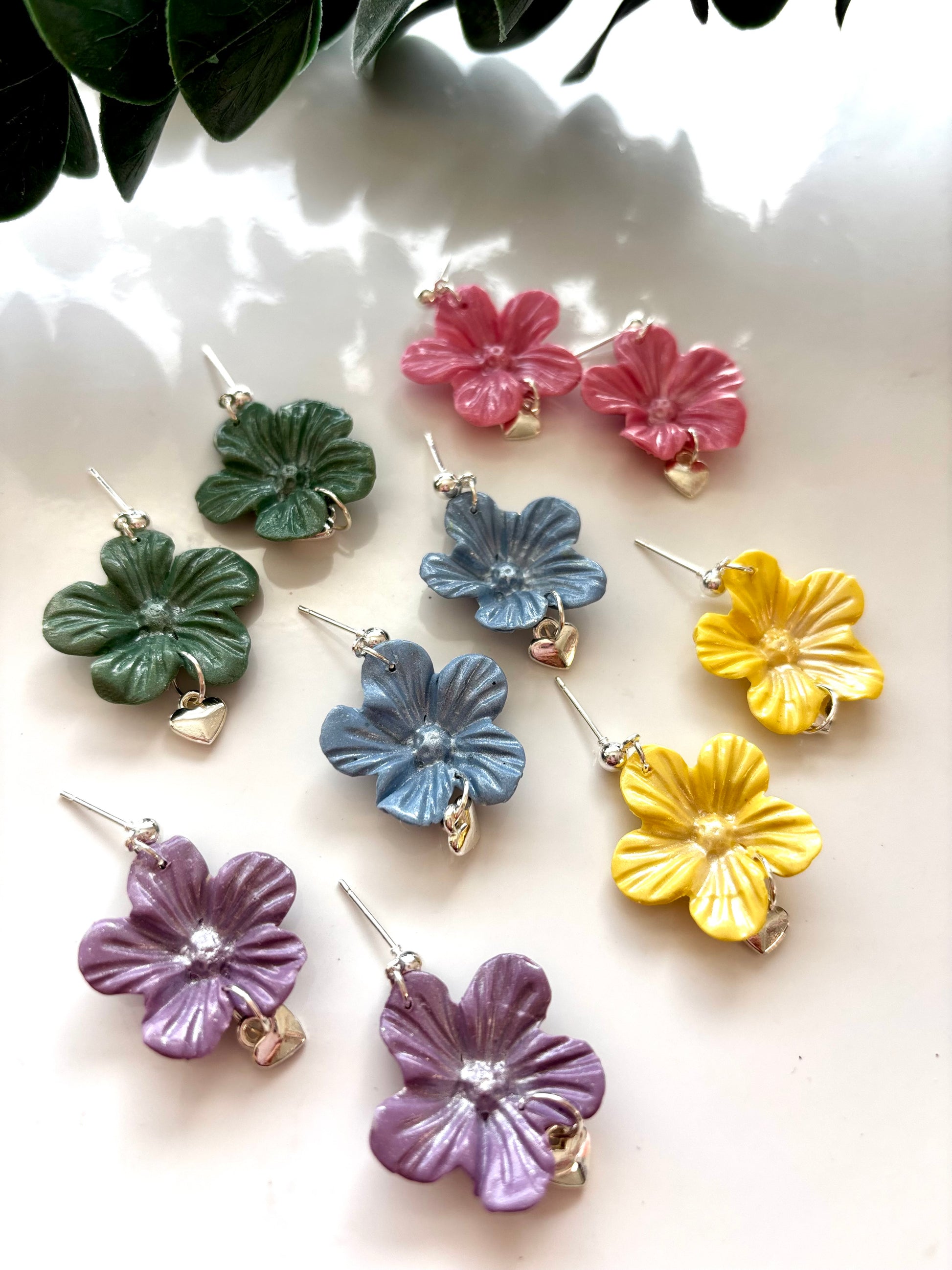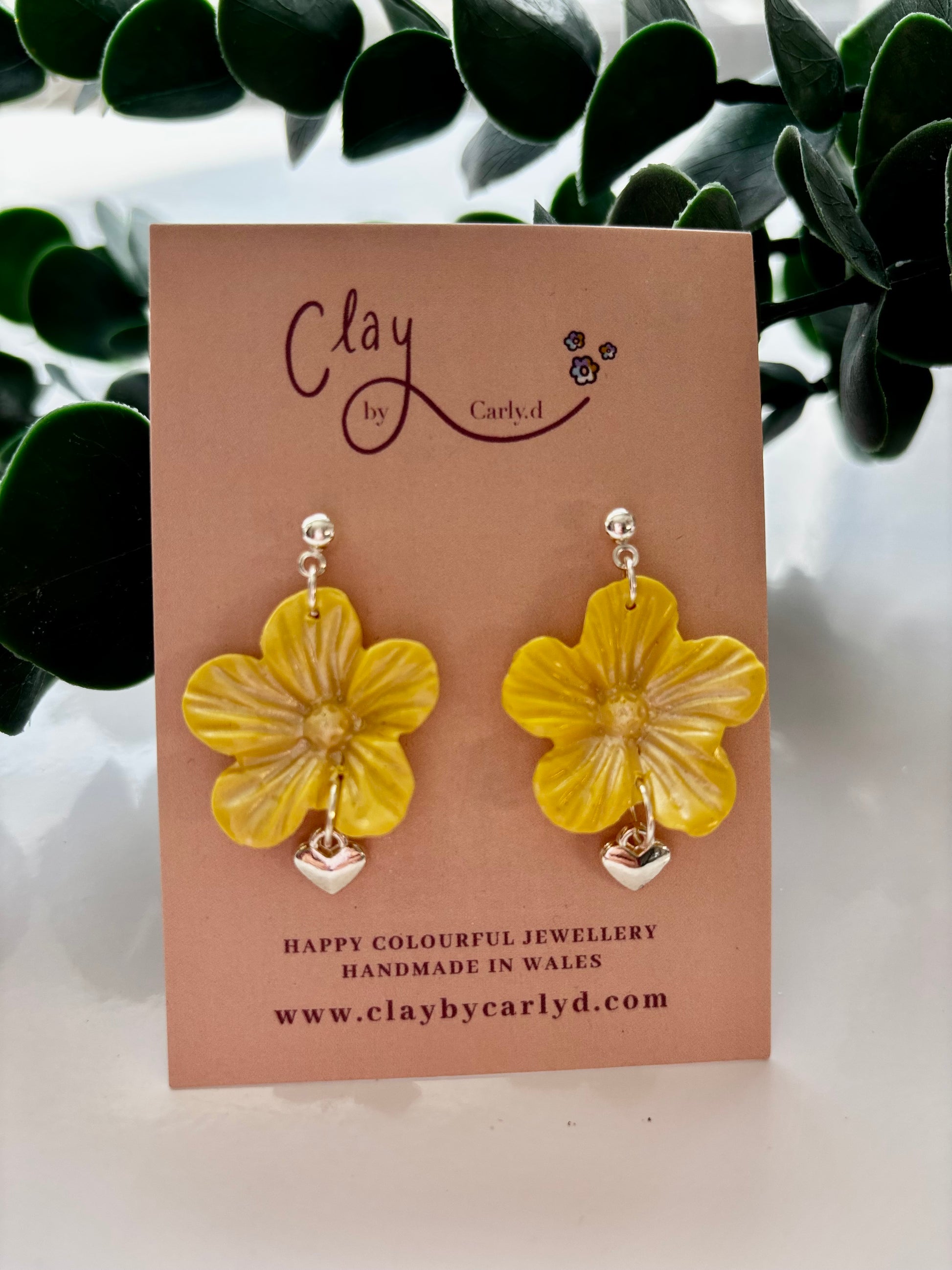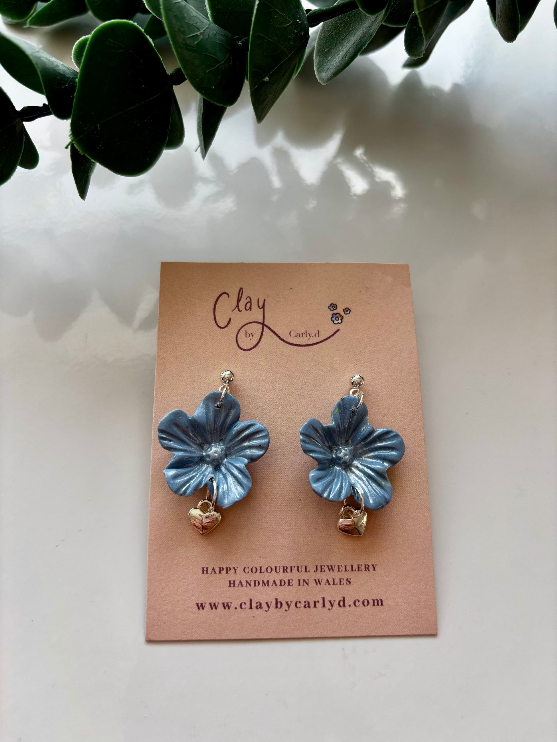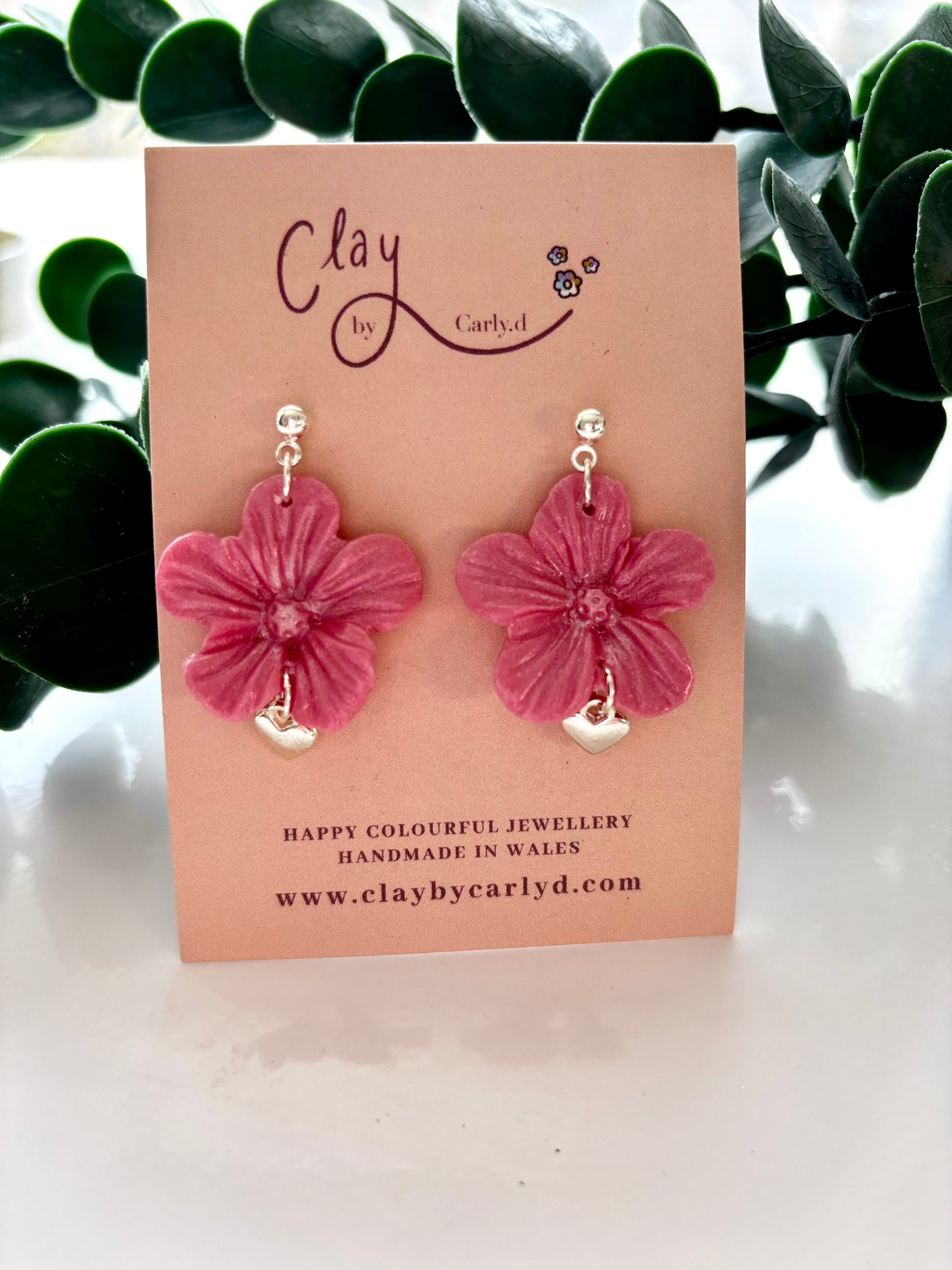 Hand- pressed polymer clay flowers on Silver plated ball studs with silver heart charm.