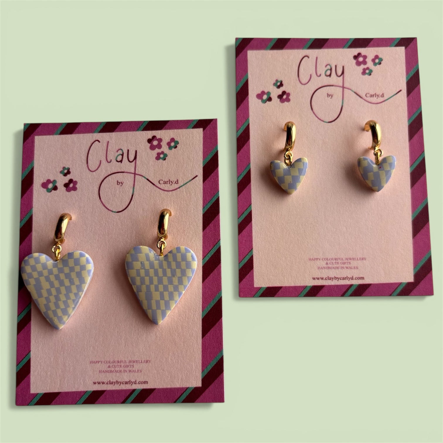 Lilac & yellow checkerboard hearts in two sizes with choice of 18k gold or silver plated huggie hoop studs.