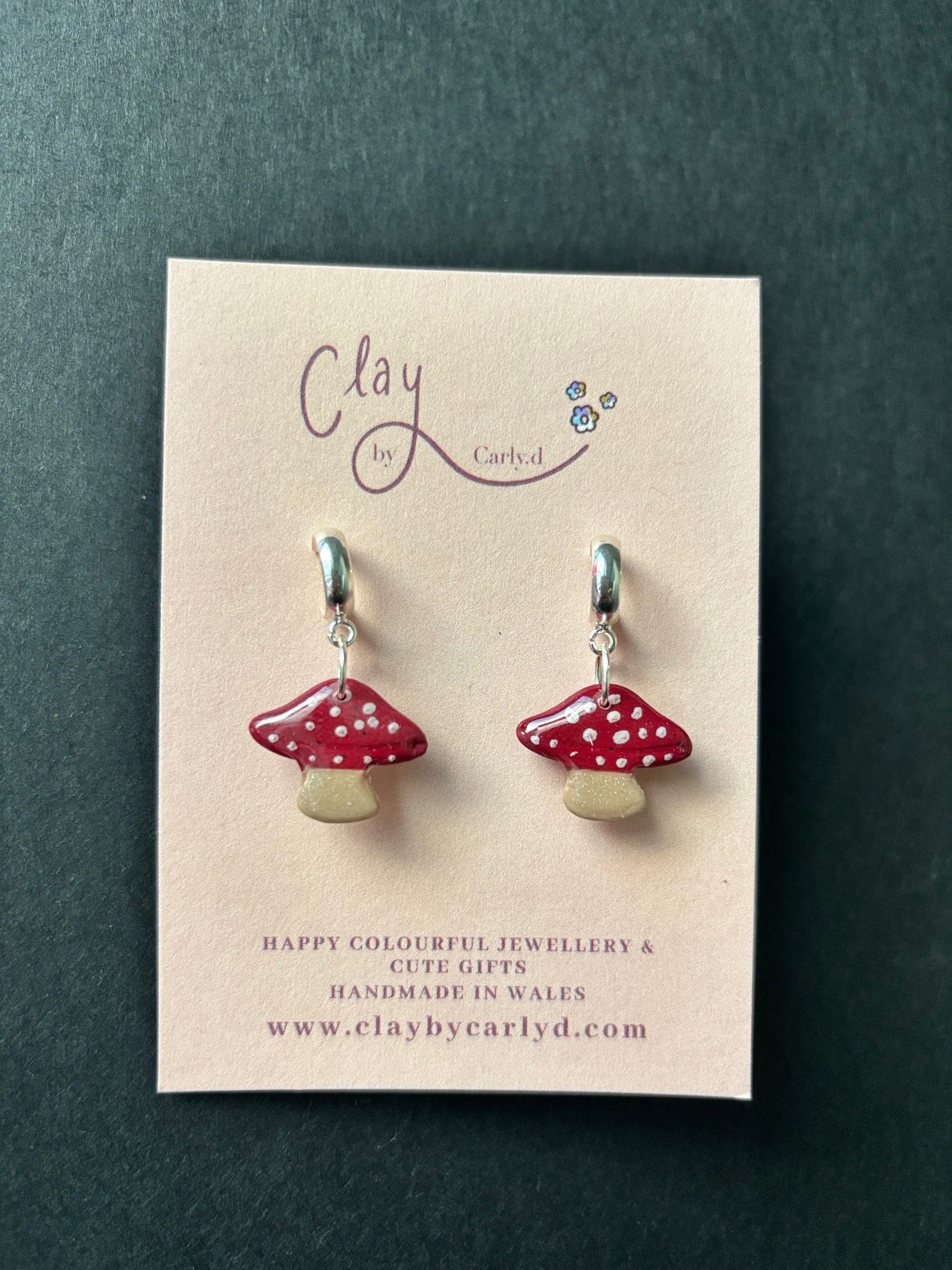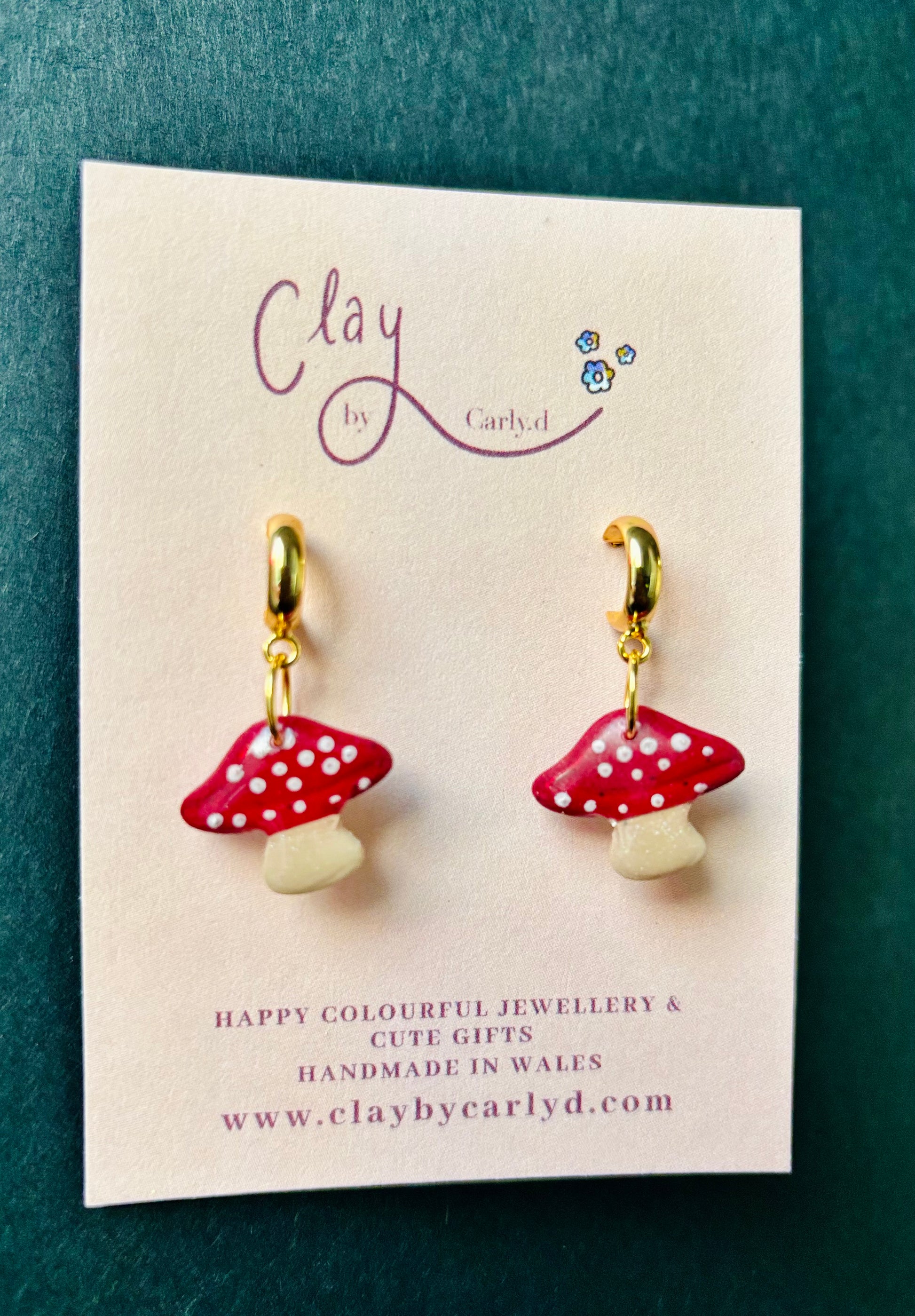Little Clay and Resin Mushrooms on choice of 18k Gold or Silver Plated Huggie Hoops