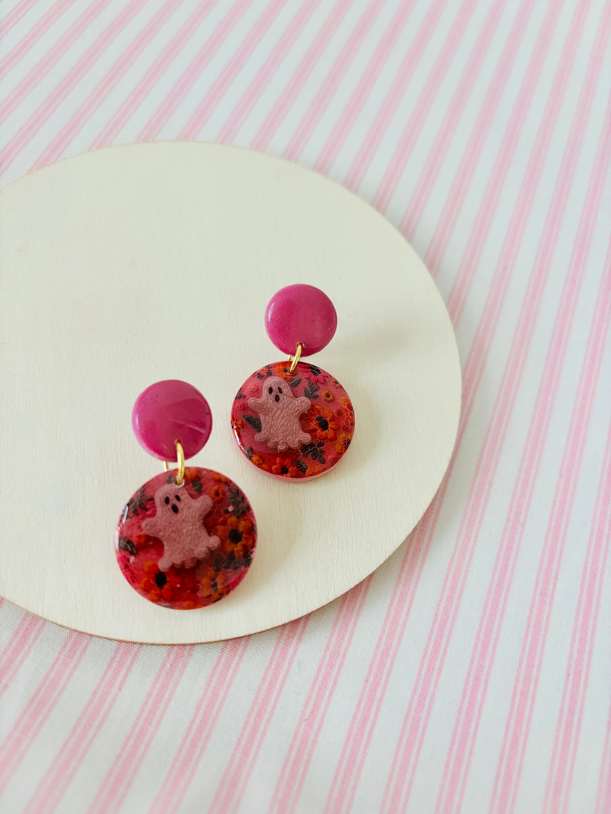 Cute Floral and Ghost Printed Clay and Resin Discs double drops on Surgical Steel Posts